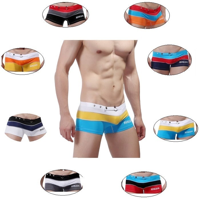 カラーブロックデザインとボタン付きウエストが特徴の、メンズ用スイムウェア。